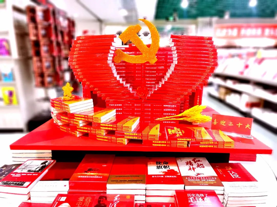 为迎接党的二十大胜利召开,黑龙江省各地新华书店“红装”焕发,通过悬挂宣传条幅、摆放图书造型等多样形式,努力营造“喜迎二十大”的浓厚氛围。