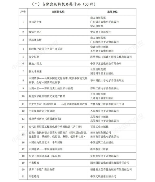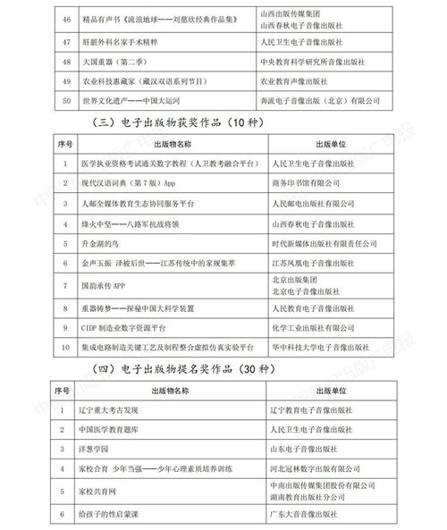 根据中央宣传部文件批复精神,由中国出版协会举办的第八届中华优秀出版物奖,于2023年2月22日评选揭晓。中华优秀出版物奖设图书奖、音像电子出版物奖、出版科研论文奖三个子项奖。本届获奖图书100种、提名奖100种;获奖音像电子出版物30种、提名奖80种;全国优秀出版科研论文30篇。现将获奖作品名单公示如下,自见报之日起7日内,如对获奖作品有异议,请列举具体事实,并署实名、联系方式,向第八届中华优秀出版物奖评委会办公室书面反映。