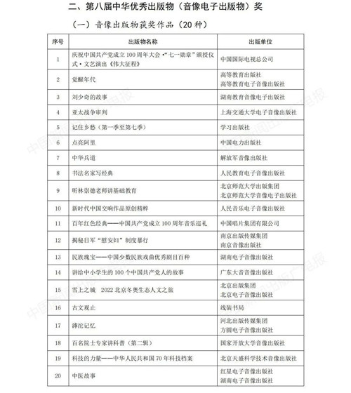2月27日,第八届中华优秀出版物奖获奖名单公示。本届获奖图书100种、提名奖100种;获奖音像电子出版物30种、提名奖80种;全国优秀出版科研论文30篇。