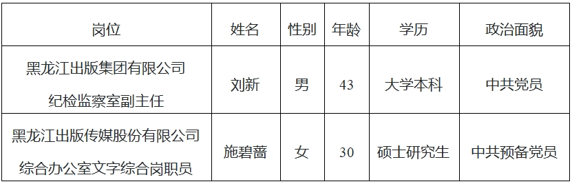 按照《黑龙江出版集团人员招录管理办法》的规定,根据《黑龙江出版集团2025年春季公开招聘工作人员公告》明确的条件、流程,经笔试、面试、考察等程序,现将拟录用人员予以公示。